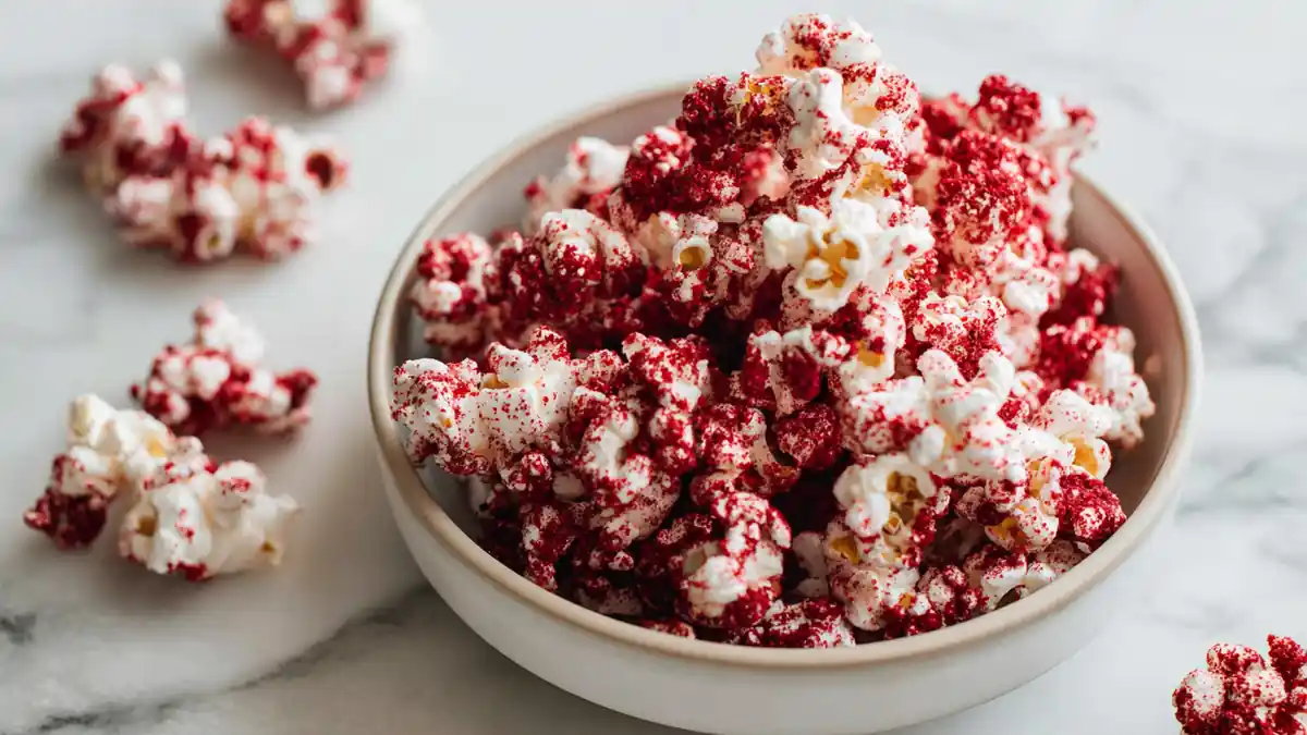 bowl of white popcorn coated with vibrant red velvet dust on marble surface