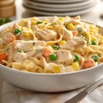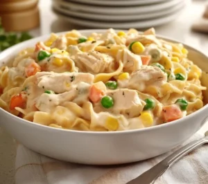 A comforting stovetop dish that combines chicken, pasta, and a creamy sauce for a hearty meal.