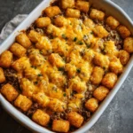 A comforting tater tot casserole filled with savory beef and melted cheese, topped with crispy tater tots.