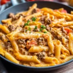 Creamy beef pasta dish made with ground beef for a quick weeknight meal.
