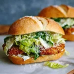 - Assemble the Sandwich: Slice the baguettes, spread dressing inside, add fried chicken, layer salad, and top with extra Parmesan. Serve immediately.