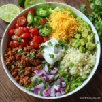 A flavorful and customizable burrito bowl made with ground chicken, cauliflower rice, and fresh vegetables, perfect for a low-carb meal.