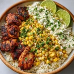 - Assemble bowls: start with cilantro-lime rice, add sliced chicken, charred corn, crumbled cotija, drizzle Mexican crema, and garnish with fresh cilantro. Squeeze lime on top.