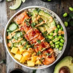 - Assemble the Bowls: Divide the rice among bowls and top with teriyaki salmon, sliced avocado, edamame, fresh mango, and cucumber.